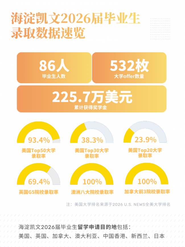 在2025-2026申请季中,北京海淀凯文学校(以下简称“海淀凯文”)毕业生延续了优异的升学表现。截至4月20日,该校2026届86名毕业生共获得532枚大学录取通知书,累计获得奖学金225.7万美元。