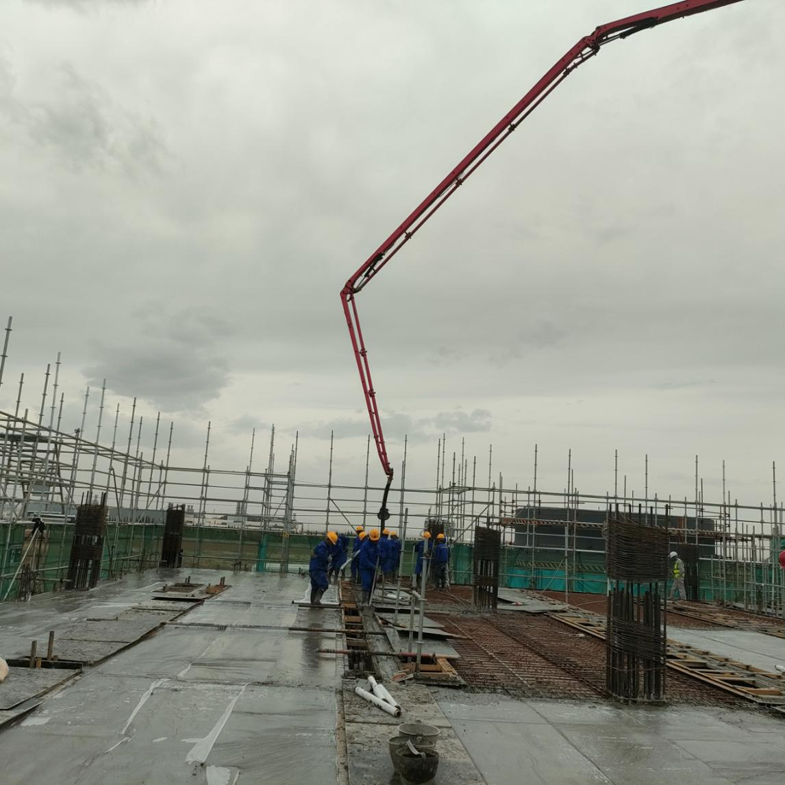 施工现场钢筋排布密集、结构复杂,部分狭小施工区域空间受限,常规混凝土浇筑振动器无法作业,成为本次施工的难点。为严守施工标准、保障工程质量,西北分公司因地制宜优化施工方案,采用人工振捣的方式精细作业,全方位把控混凝土密实度、平整度,杜绝施工质量隐患,牢牢守住工程品质底线。施工前,西北分公司严格落实安全生产管理制度,对16名施工突击队员开展全面的安全技术交底,明确施工流程、质量标准、安全规范及岗位职责,细化各环节施工要求。施工过程中,全体队员分工明确、配合默契,标准化完成扶泵头、混凝土振捣、楼面找平、覆膜养护等一系列工序。为抢抓施工进度,保障节点顺利完成,突击队员们争分夺秒,简短时间轮流就餐,稍作休整后便迅速重返施工岗位,以高度的责任心和饱满的斗志直面施工压力,用坚守与实干推进工程建设提速提质。